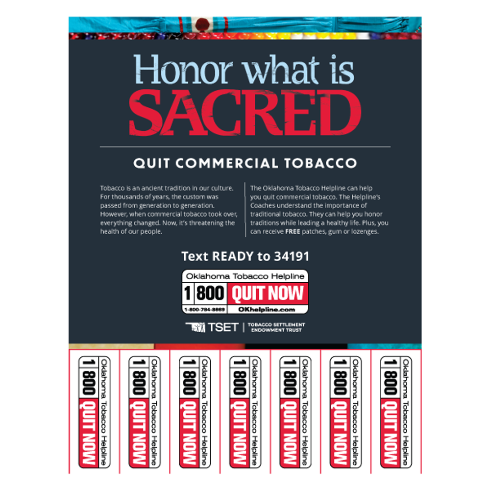 This tear-off poster features the Oklahoma Tobacco Helpline number, which individuals can easily remove and take with them. It shares information about the Oklahoma Tobacco Helpline and additional free resources available to help Native Americans quit commercial tobacco.